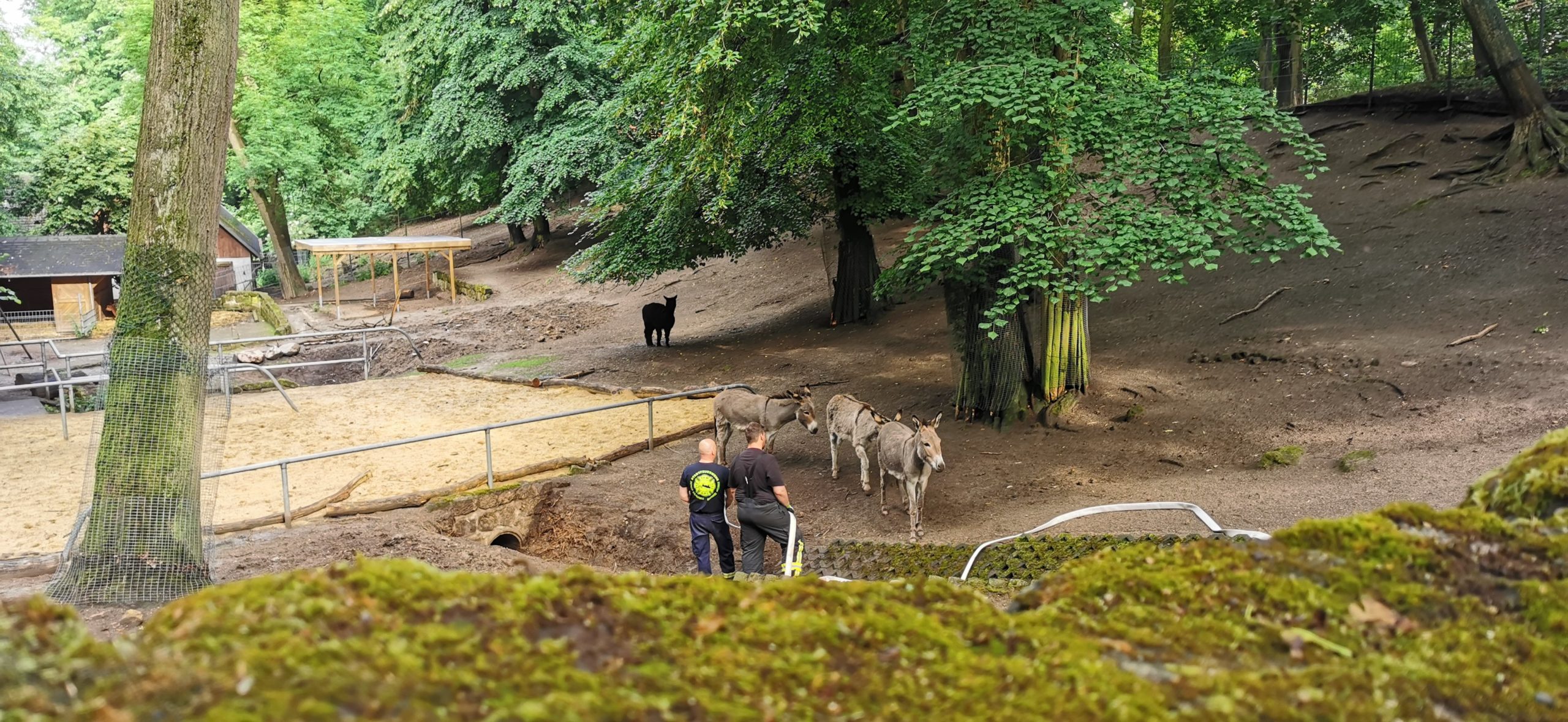 Nach kurzer Zeit konnten die Ablagerungen soweit entfernt werden, dass das Wasser wieder normal abfließen konnte und das Becken im Gehege sich wieder füllt.