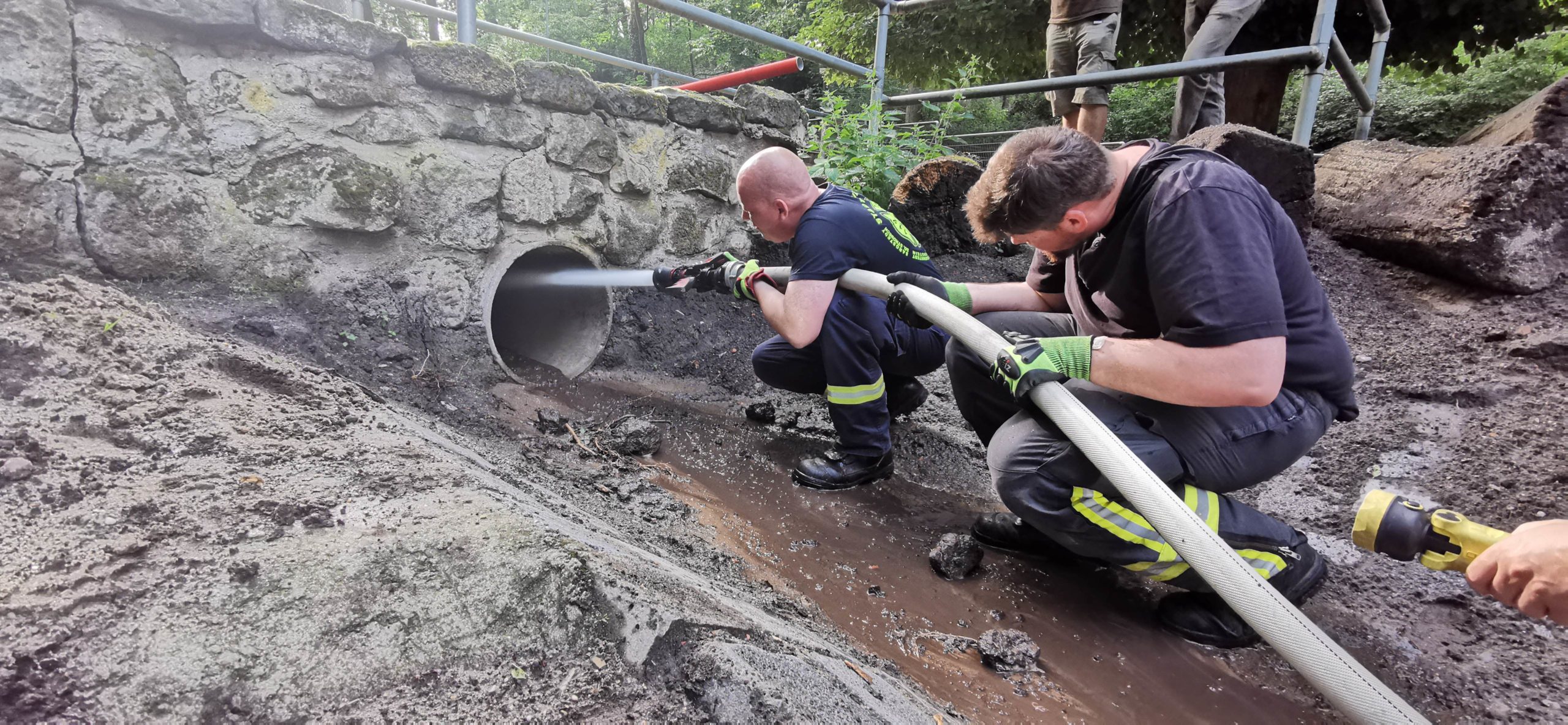 Mit einem C-Rohr versuchte die Feuerwehr, diese Ablagerungen mit Druck zu beseitigen.