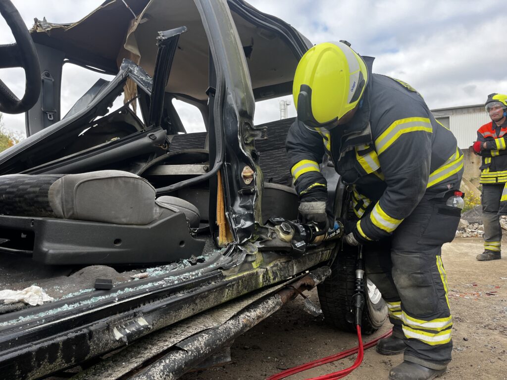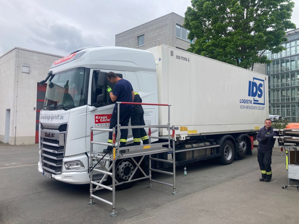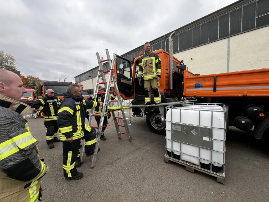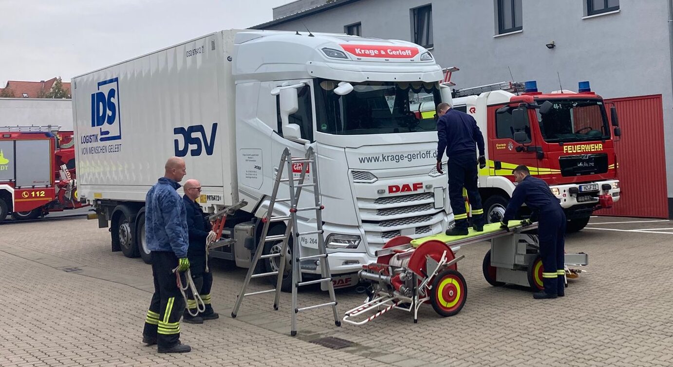 Begonnen wurde am 27.09.2025 mit einem kleinen theoretischen Teil, in dem es um die technischen Daten und die Dimensionen eines LKW ging. So wurde zum Beispiel auf die Abmessungen, das Gewicht und die Flüssigkeitsstände (Kraftstoff und Öle) eingegangen. Zudem wurden Zugangsmöglichkeiten und das Retten einer Person aus der Fahrerkabine besprochen. Außerdem stellte Kollege Bamberg verschiedene Möglichkeiten vor um zusätzlich zu der bestehenden Arbeitsplattform eine weitere provisorische Arbeitsplattform zu schaffen um an der LKW Kabine, beispielsweise mit dem hydraulischem Rettungsgerät arbeiten zu können. Nach der Theorie folgte nun die Praxis. Hierfür stand an diesem Tag ein moderner LKW der Firma Krage & Gerloff aus Schwanebeck zur Verfügung, an dem das erlernte Wissen angewandt werden konnte.