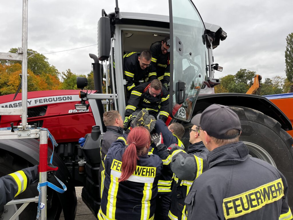 Außerdem stand eine landwirtschaftliche Zugmaschine zur Verfügung. Hier wurden ebenfalls die technischen Daten besprochen und eine Personenrettung durchgeführt. An zwei weiteren Stationen ging es zusätzlich noch um die Technische Hilfeleistung nach einem klassischen Verkehrsunfall. Hierzu simulierte man unter anderem einen Frontalzusammenstoß zwischen zwei PKW und einem PKW in Seitenlage. Die Besonderheit war hier, dass die Feuerwehr Wegeleben mit ihrem neuen hydraulischem Rettungsgerät auf Akkubasis vor Ort war. So konnten die Kameraden aus Halberstadt die neue Technik im Einsatz testen.