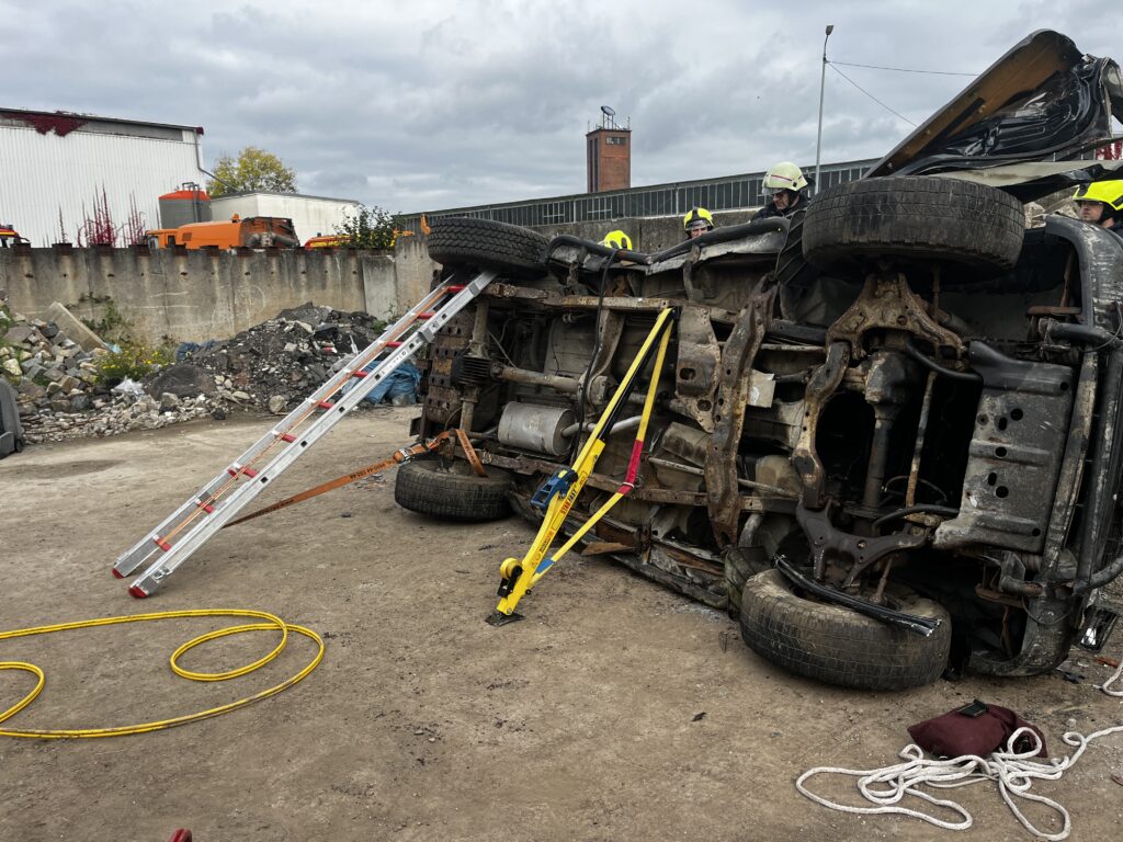 Am 11.10.2025 wurde die Praxiseinheit auf dem Gelände der STALA in Halberstadt noch einmal erweitert. Hierzu standen mehrere LKW der STALA zur Verfügung an denen das Aufbauen der Rettungsplattformen und die Personenrettung in Zusammenarbeit mit dem Rettungsdienst geübt werden konnte.