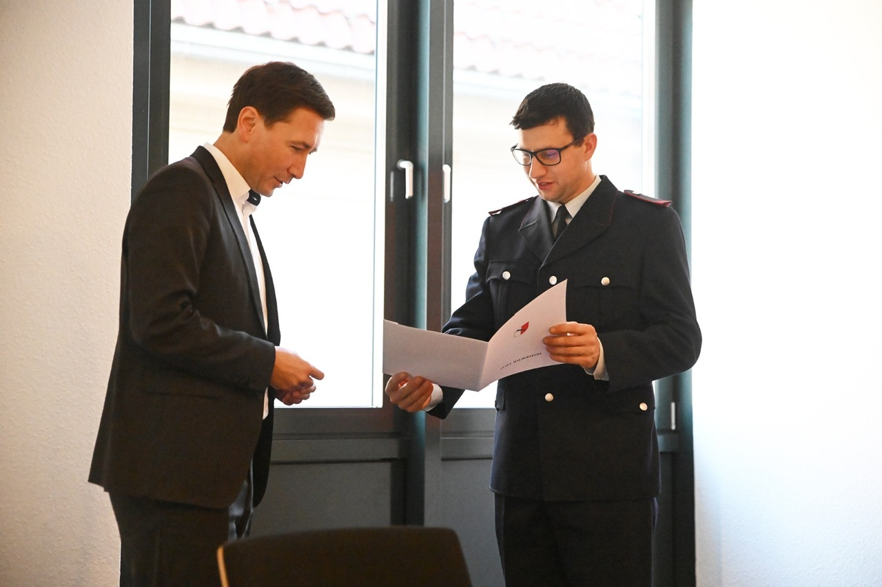 Brandmeister Philipp Kluckhenn konnte mit Wirkung zum 01. Januar 2026 zum Beamten auf Lebenszeit ernannt werden. Zu den Gratulanten gehörte auch Abteilungsleiter Ingo Wetzel.