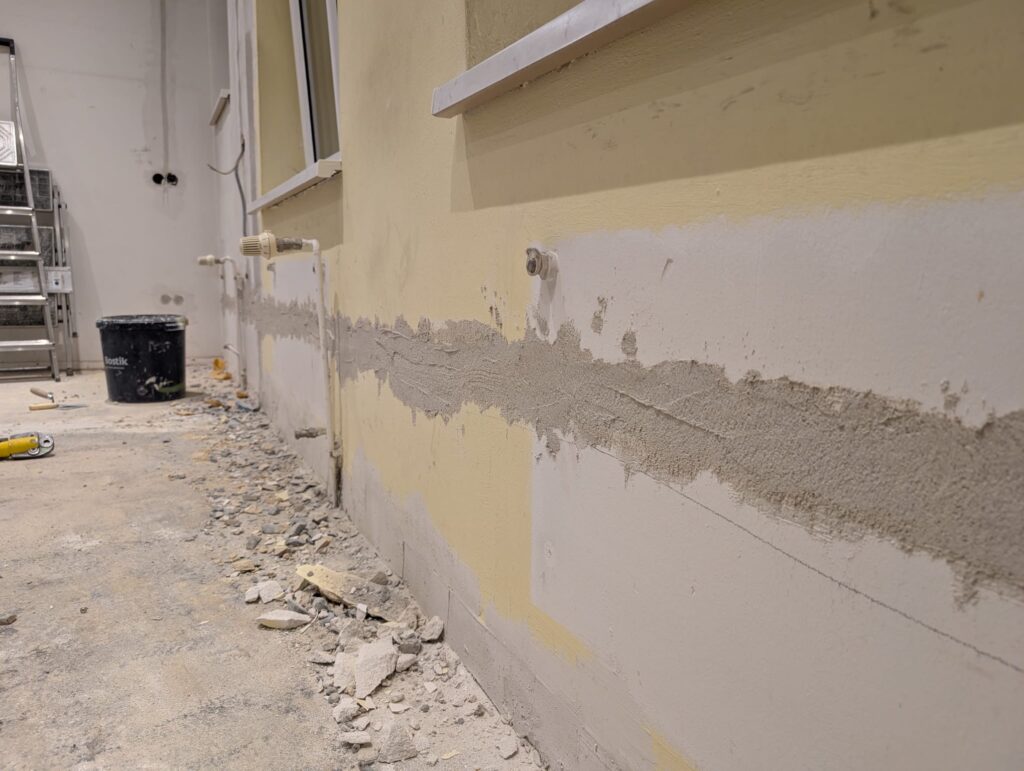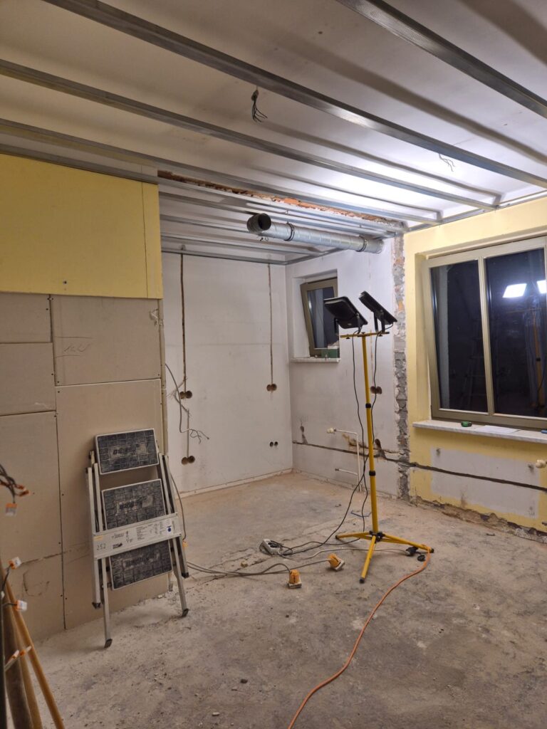 Zu Beginn der Arbeiten wurde eine Wand entfernt um den Küchenbereich zu vergrößern, um eine offenere und funktionalere Raumgestaltung zu ermöglichen. Im Anschluss erfolgte die komplette Neuverlegung der elektrischen Leitungen, um den aktuellen Anforderungen und Sicherheitsstandards gerecht zu werden.