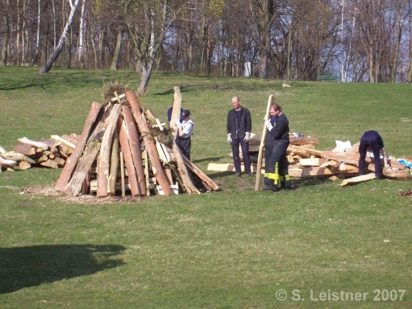 Einen großen Anteil am Gelingen des Osterfeuers auf der Jahnwiese hatten neben der Freiwilligen Feuerwehr, auch die Kameraden der Jugendfeuerwehr Halberstadt. Schon am frühen Nachmittag galt es, Holz für das Osterfeuer zusammenzutragen und so aufzuschichten, dass es hoch in den Abendhimmel lodern konnte. Rege Beteiligung gab es auch beim Aufbau der Imbiss- und Getränkestände sowie der dazugehörigen Tische und Bänke. Spätestens um 19.00 Uhr sollte schließlich alles fertig sein. Denn zu diesem Zeitpunkt startete der Fackelumzug, angeführt vom Spielmannszug der Freiwilligen Feuerwehr Harsleben und den Mitgliedern der Jugendfeuerwehr, die dann auch das Osterfeuer entzündeten.